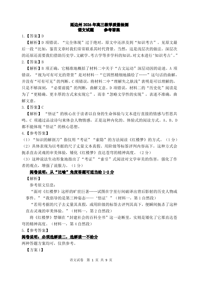 吉林省延边朝鲜族自治州2026届高三下学期教学质量检测 语文答案.pdf