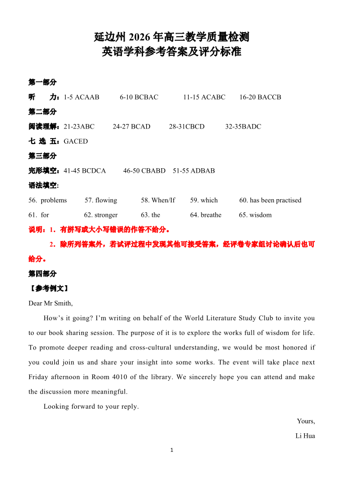 吉林省延边朝鲜族自治州2026届高三下学期教学质量检测 英语答案.pdf