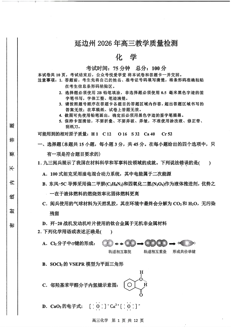 吉林省延边朝鲜族自治州2026届高三下学期教学质量检测 化学.pdf