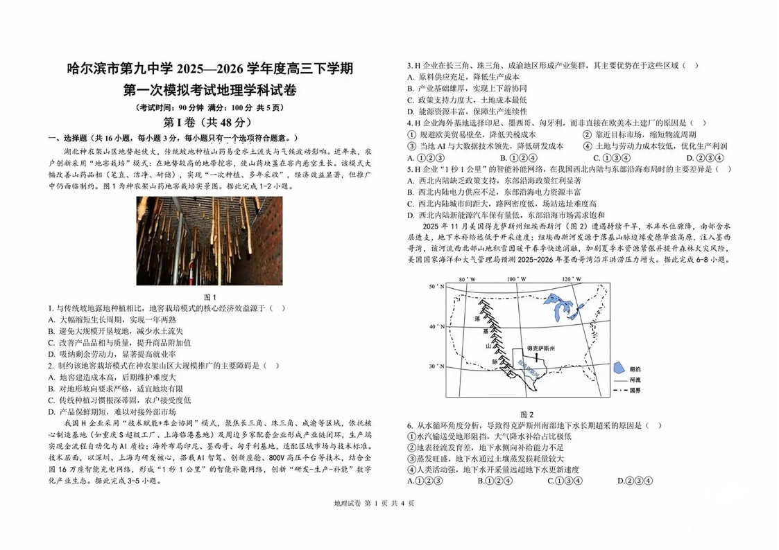 哈尔滨市第九中学2025~2026学年度高三下学期第一次模拟考试 地理试题(含答案).pdf