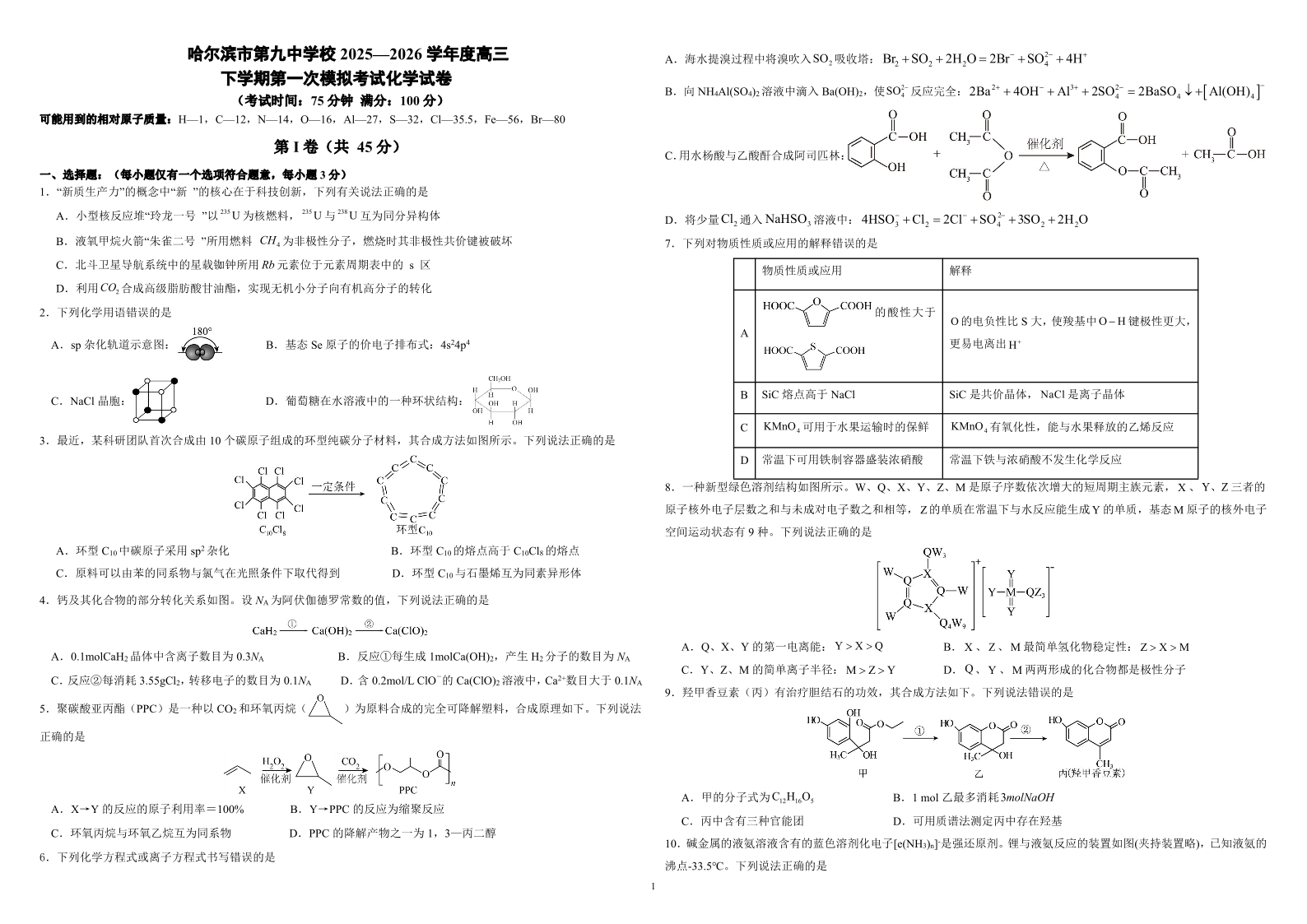 哈尔滨市第九中学2025~2026学年度高三下学期第一次模拟考试 化学试题(含答案).pdf