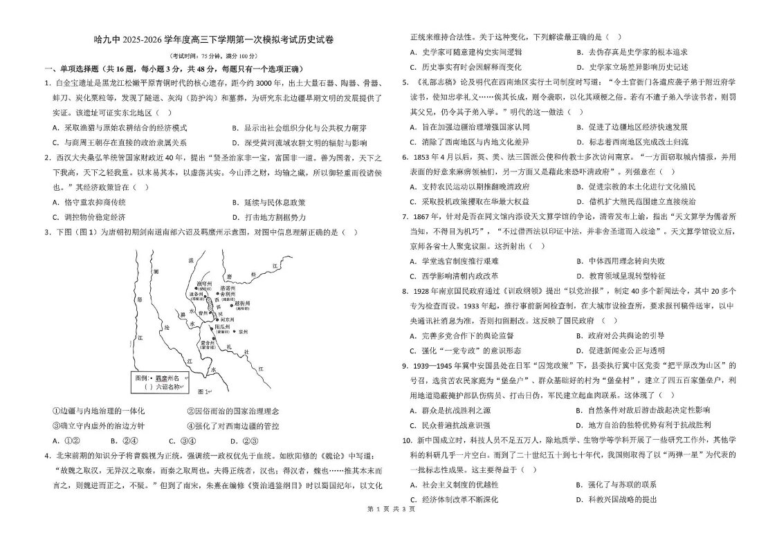 哈尔滨市第九中学2025~2026学年度高三下学期第一次模拟考试 历史试题(含答案).pdf
