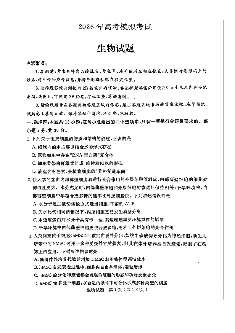 济宁市2026届高三年级一模考试 生物.pdf