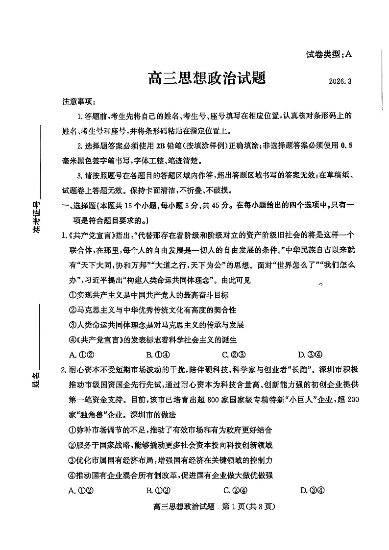山东省滨州市2026届高三年级一模考试 政治.pdf