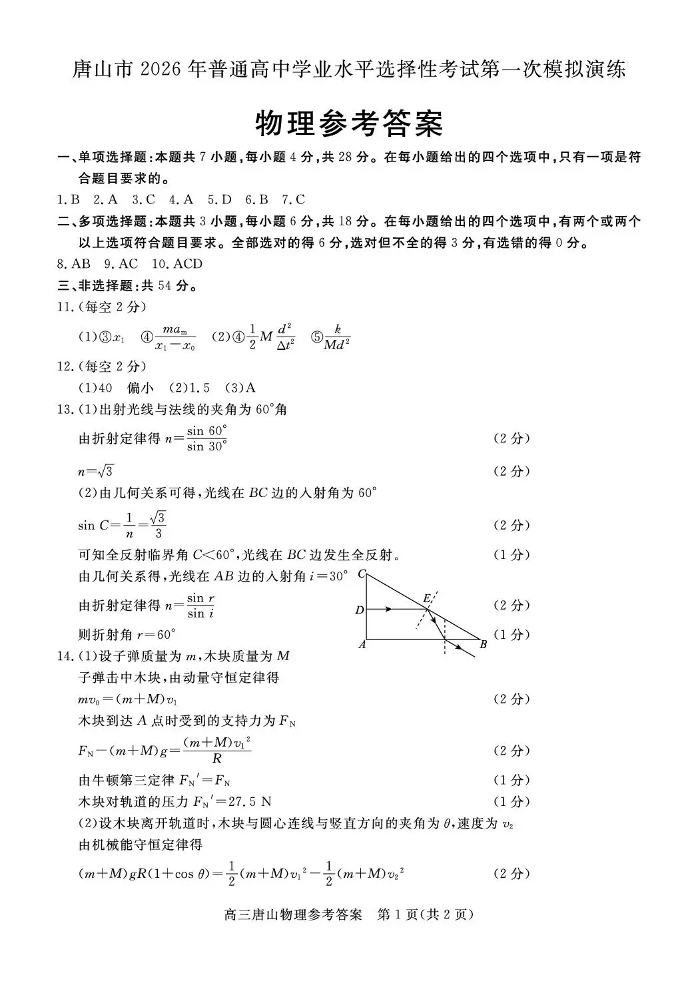 唐山市2026年普通高等学校招生统一考试第一次模拟演练 物理答案.pdf