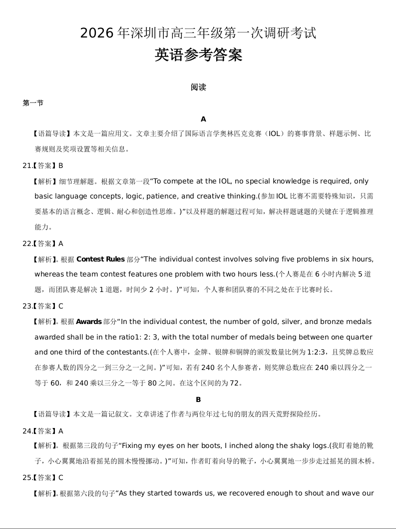 2026年深圳市高三年级第一次调研考试 英语答案.docx
