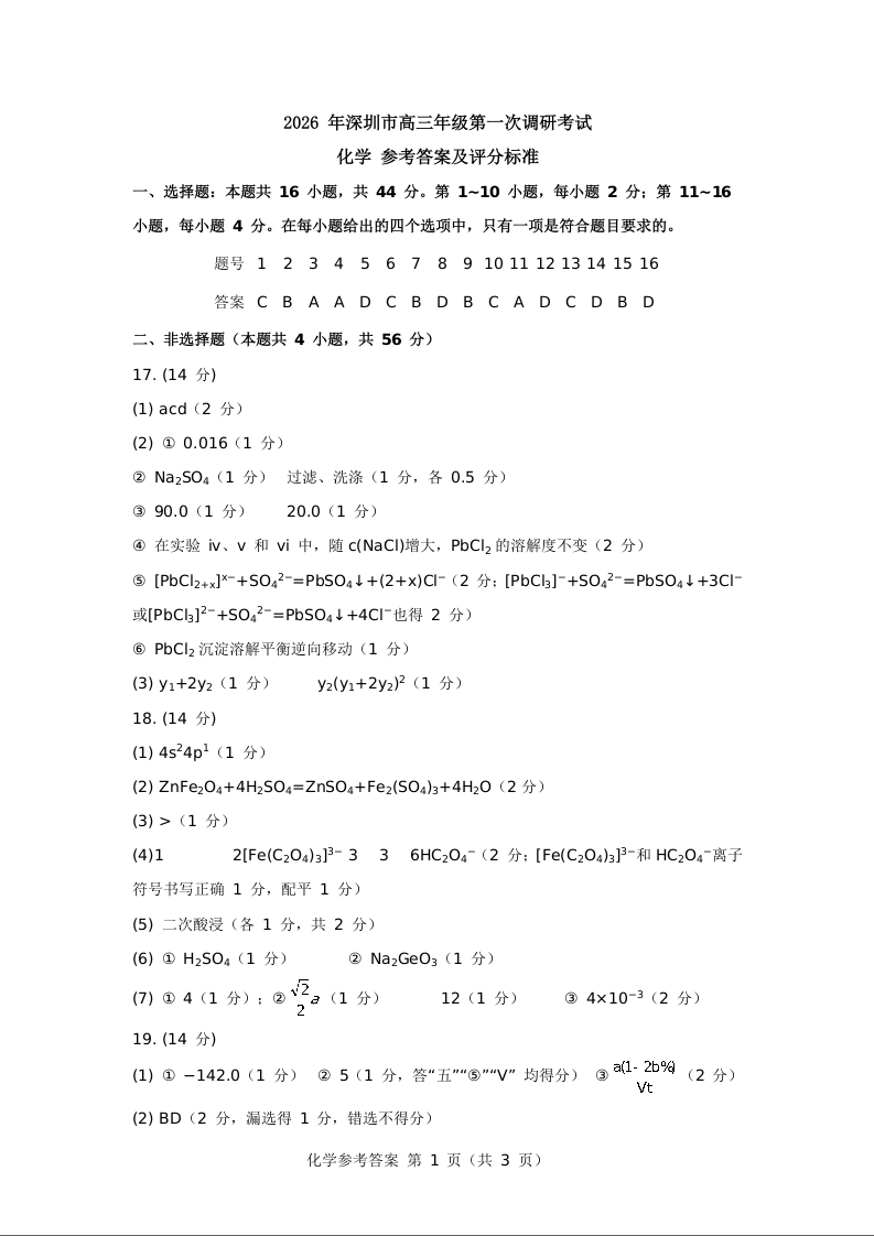2026年深圳市高三年级第一次调研考试 化学答案.docx