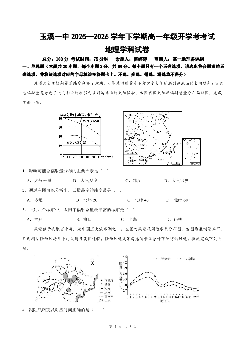 云南省玉溪市一中2025-2026学年高一下学期开学考试 地理试题(含答案).pdf
