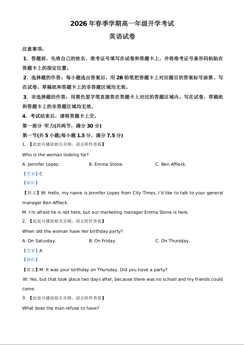 湖北省恩施高中教学联盟2025-2026学年高一下学期开学考试 英语答案.docx