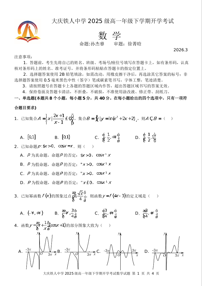 黑龙江省大庆铁人中学2025-2026学年高一下学期开学考试 数学.docx