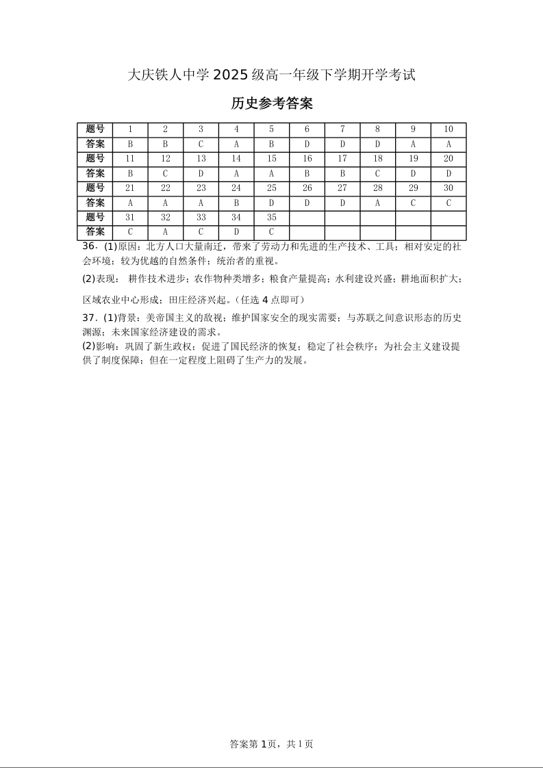 黑龙江省大庆铁人中学2025-2026学年高一下学期开学考试 历史答案.docx