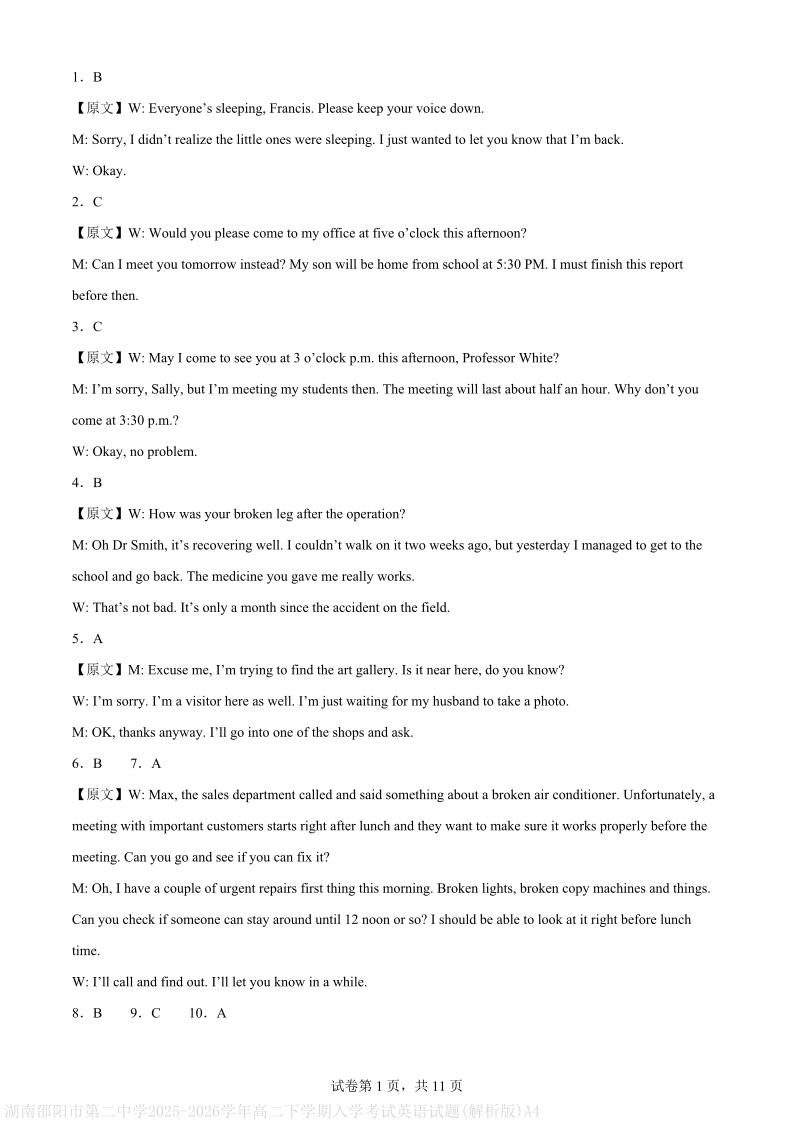 湖南省邵阳市第二中学2025-2026学年高二下学期入学考试 英语答案.pdf