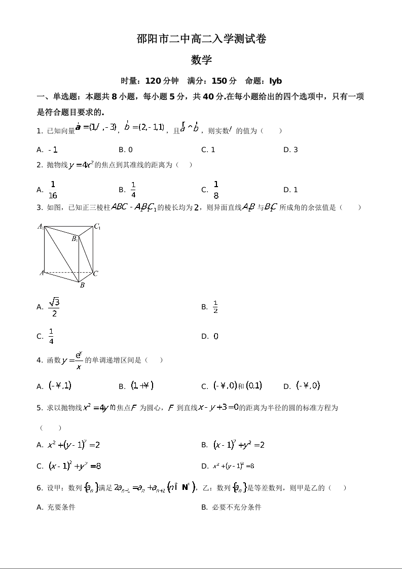 湖南省邵阳市第二中学2025-2026学年高二下学期入学考试 数学.docx