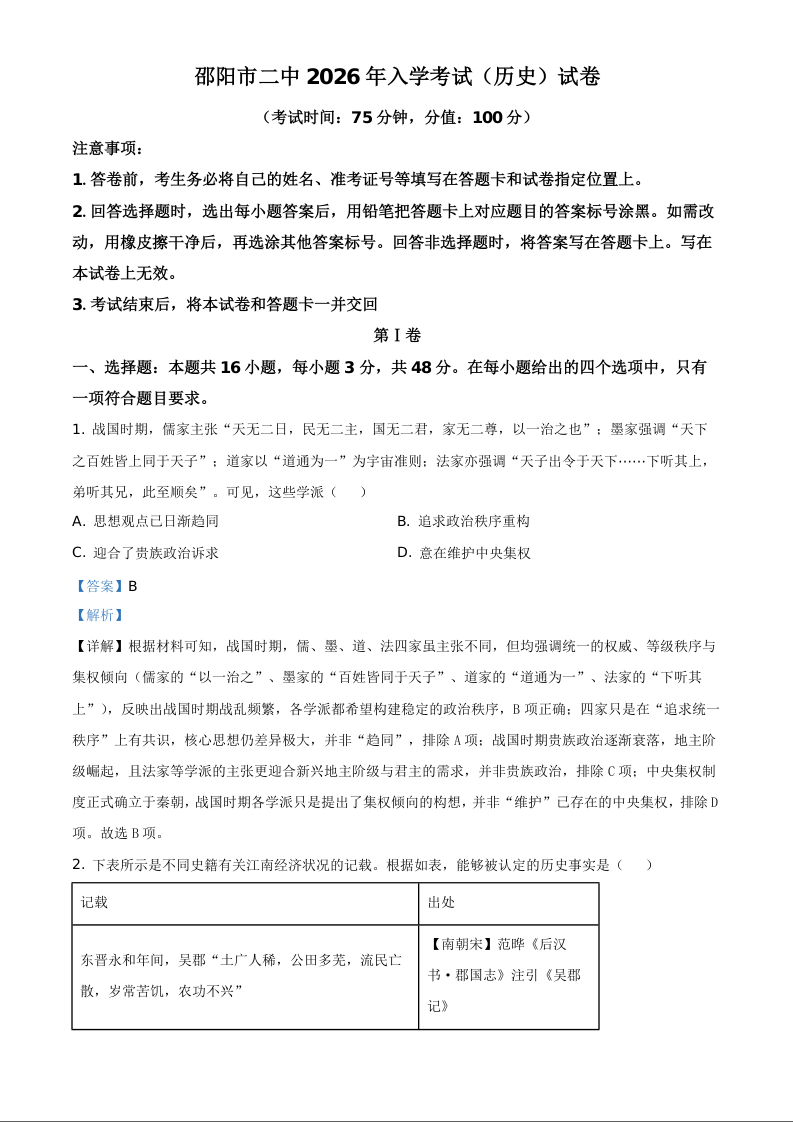 湖南省邵阳市第二中学2025-2026学年高二下学期入学考试 历史答案.docx