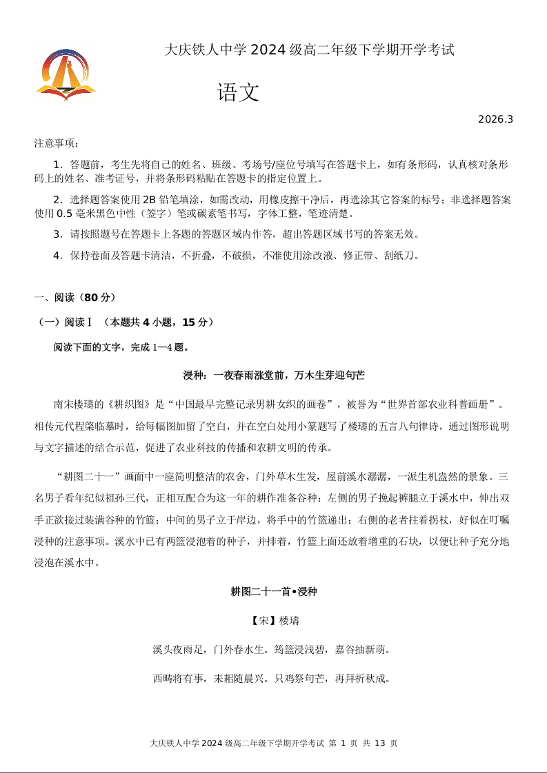 黑龙江省大庆铁人中学2025-2026学年高二下学期开学考试 语文.docx