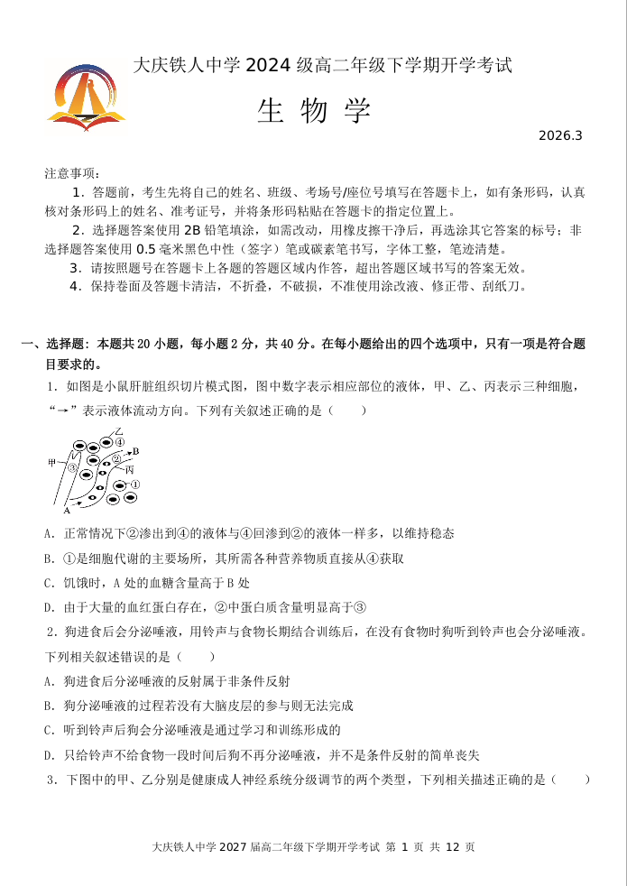 黑龙江省大庆铁人中学2025-2026学年高二下学期开学考试 生物.docx