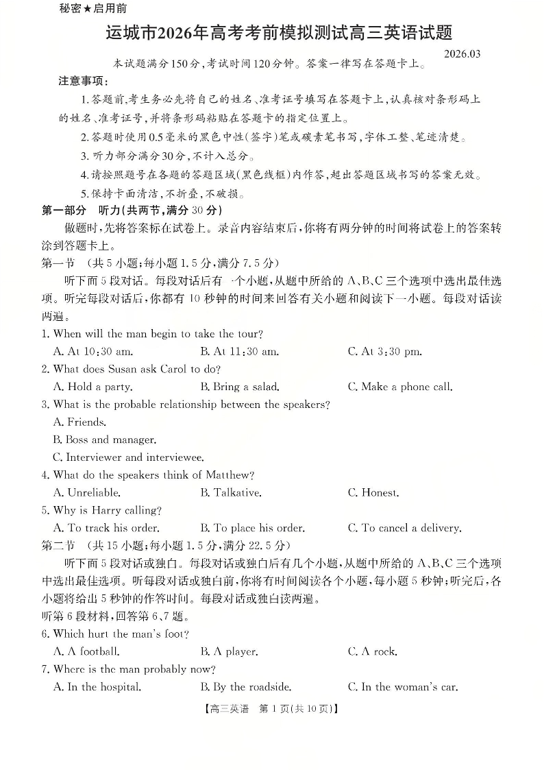 运城市2026年高考考前模拟测试 英语.pdf