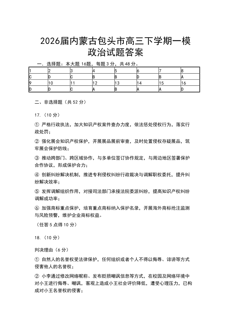 内蒙古包头市2026年高三第一次模拟考试 政治答案.pdf