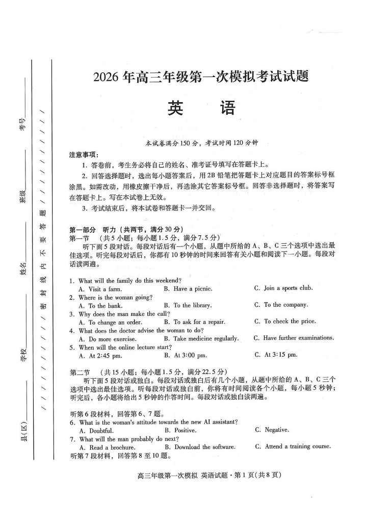 甘肃省2026年高三年级第一次模拟考试 英语试题(含答案).pdf
