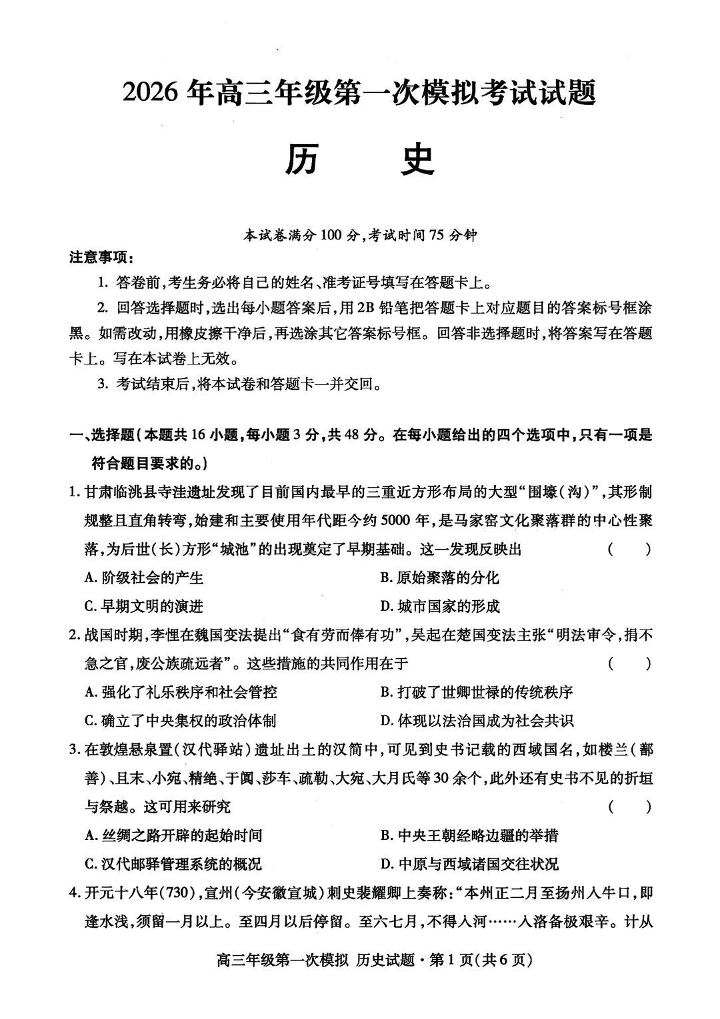 甘肃省2026年高三年级第一次模拟考试 历史试题(含答案).pdf