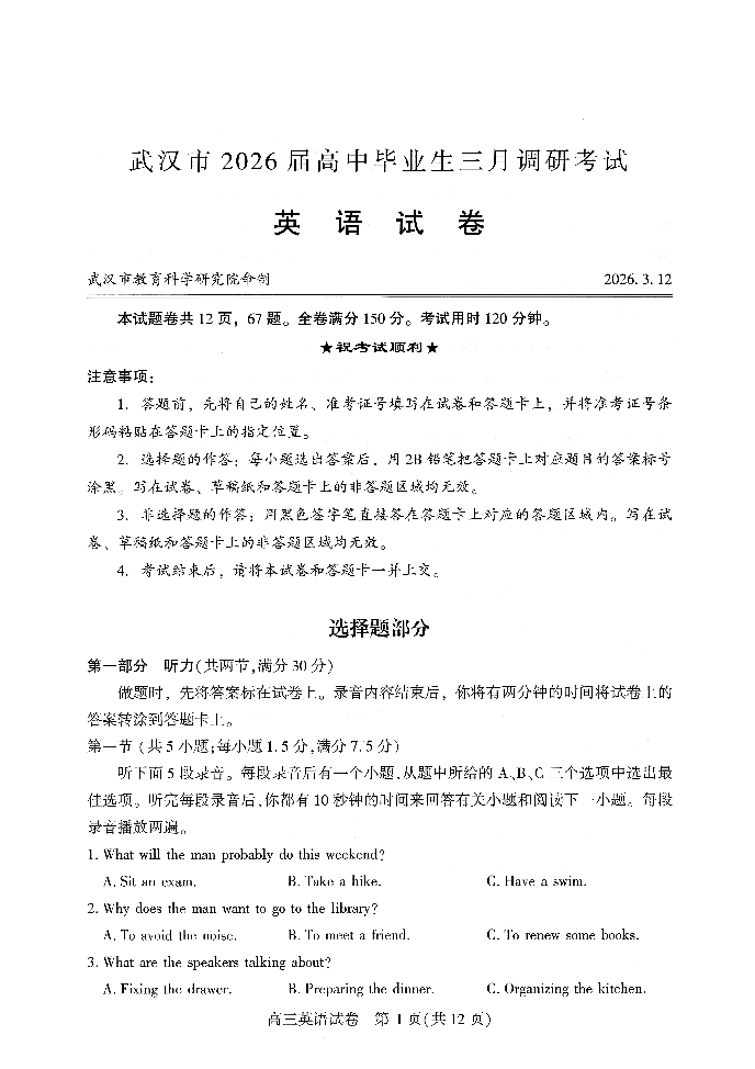 武汉市2026届高中毕业生三月调研考试 英语.pdf