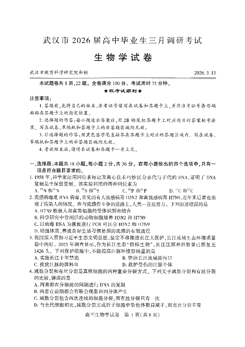 武汉市2026届高中毕业生三月调研考试 生物.pdf