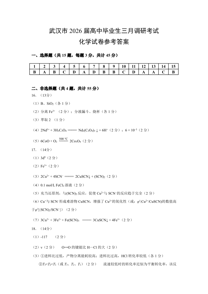 武汉市2026届高中毕业生三月调研考试 化学答案.pdf