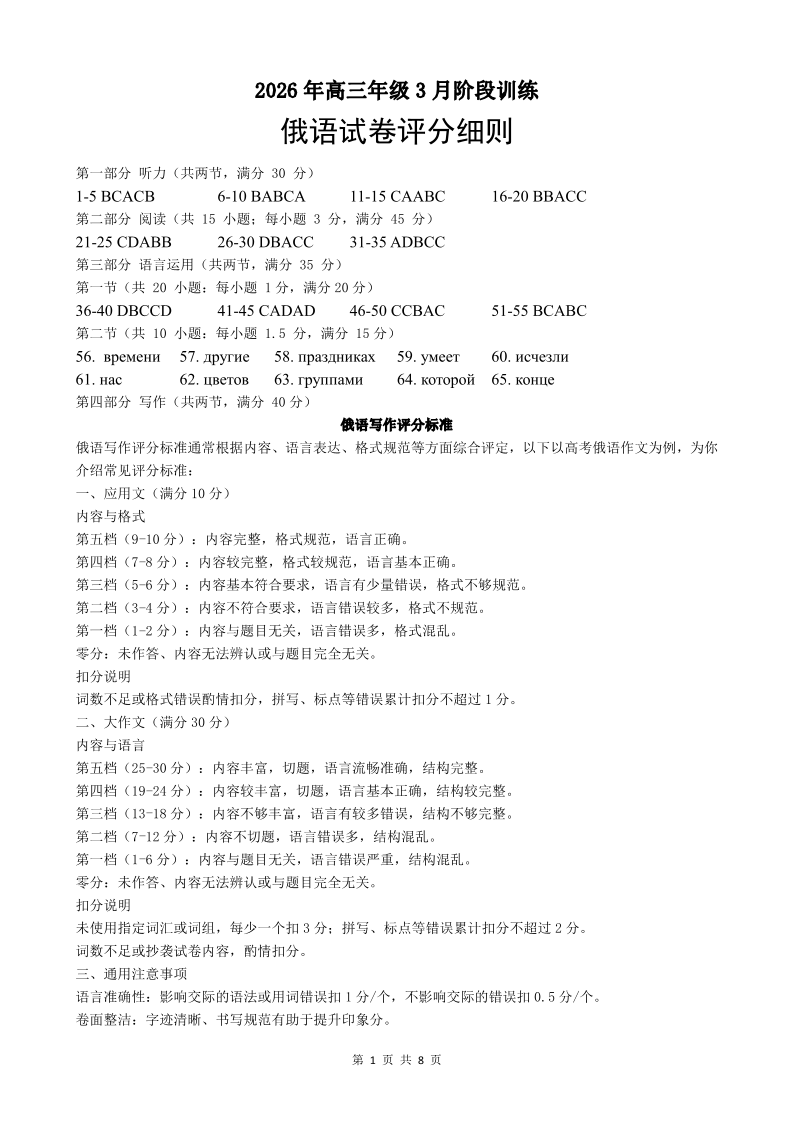 武汉市2026届高中毕业生三月调研考试 俄语答案.pdf