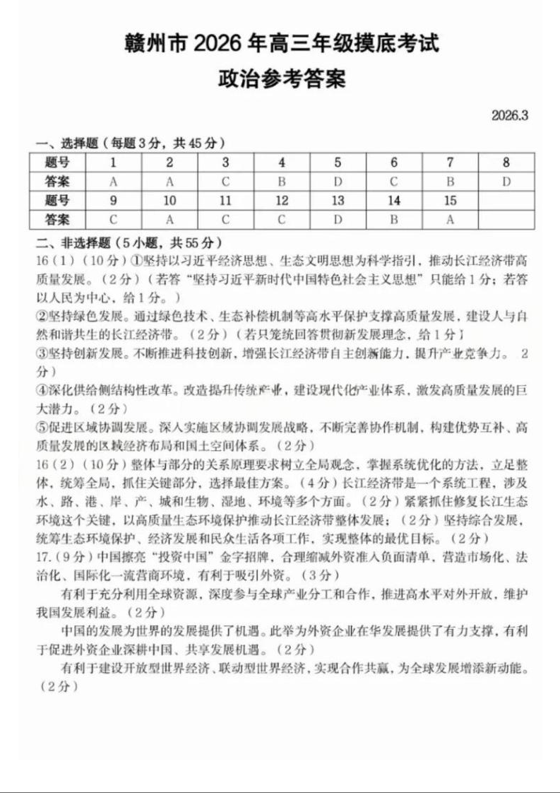 江西省赣州市2026年高三下学期3月摸底考试 政治答案.docx