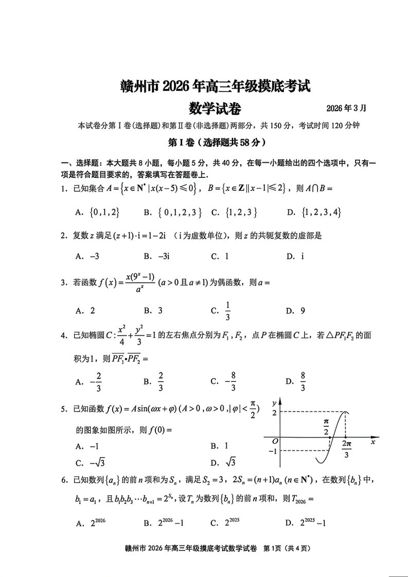 江西省赣州市2026年高三下学期3月摸底考试 数学.docx