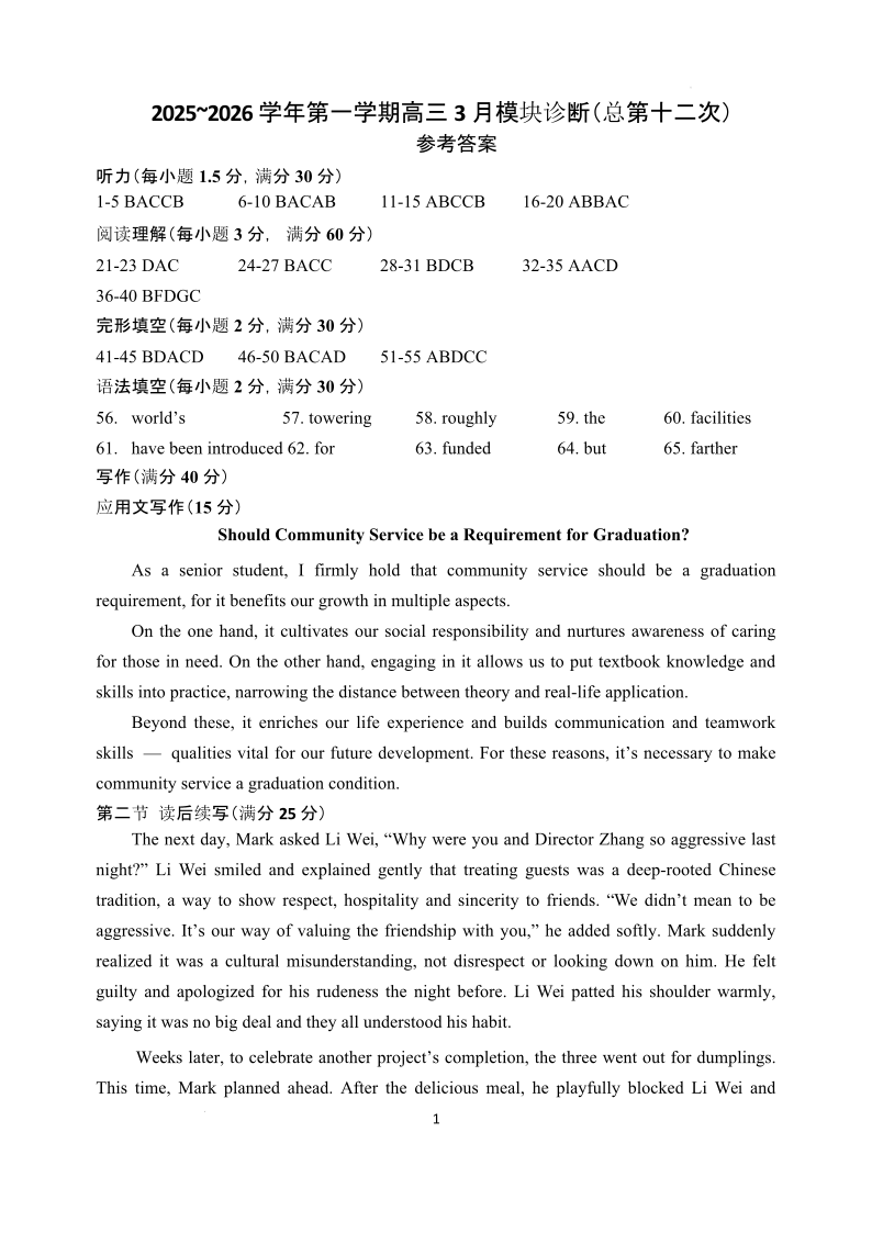 山西大学附属中学校2025-2026学年高三年级第二学期3月模块诊断 英语答案.pdf