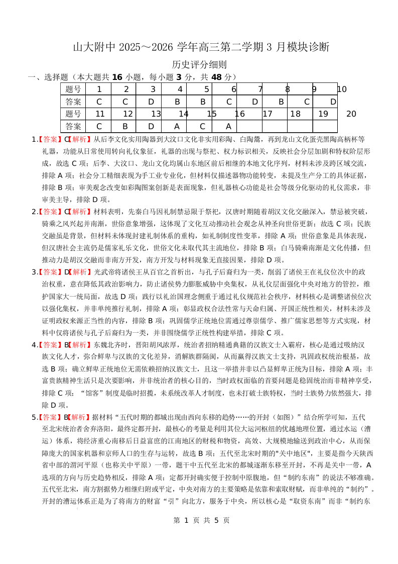 山西大学附属中学校2025-2026学年高三年级第二学期3月模块诊断 历史答案.docx