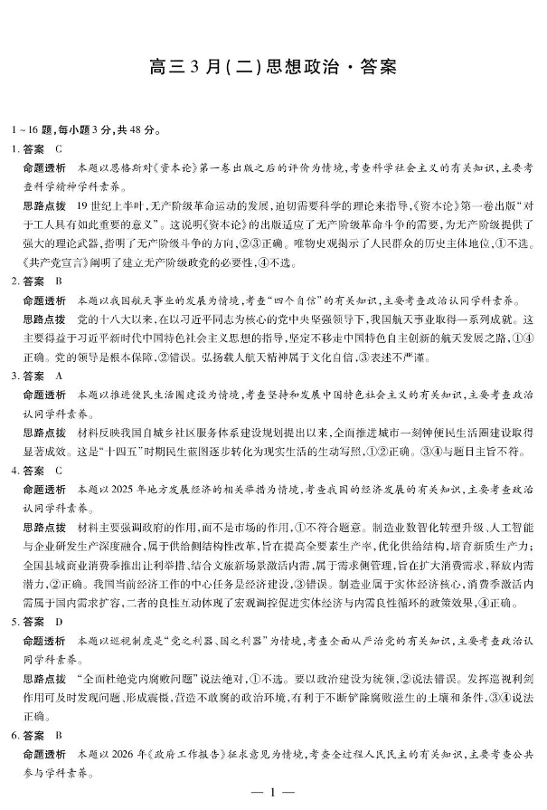 安徽省部分学校2026届高三3月联考 政治(二)答案.pdf