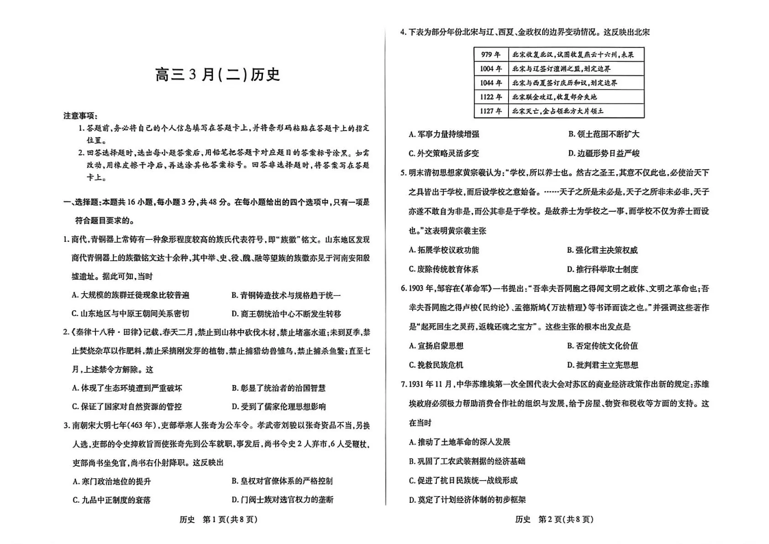 安徽省部分学校2026届高三3月联考 历史(二).pdf