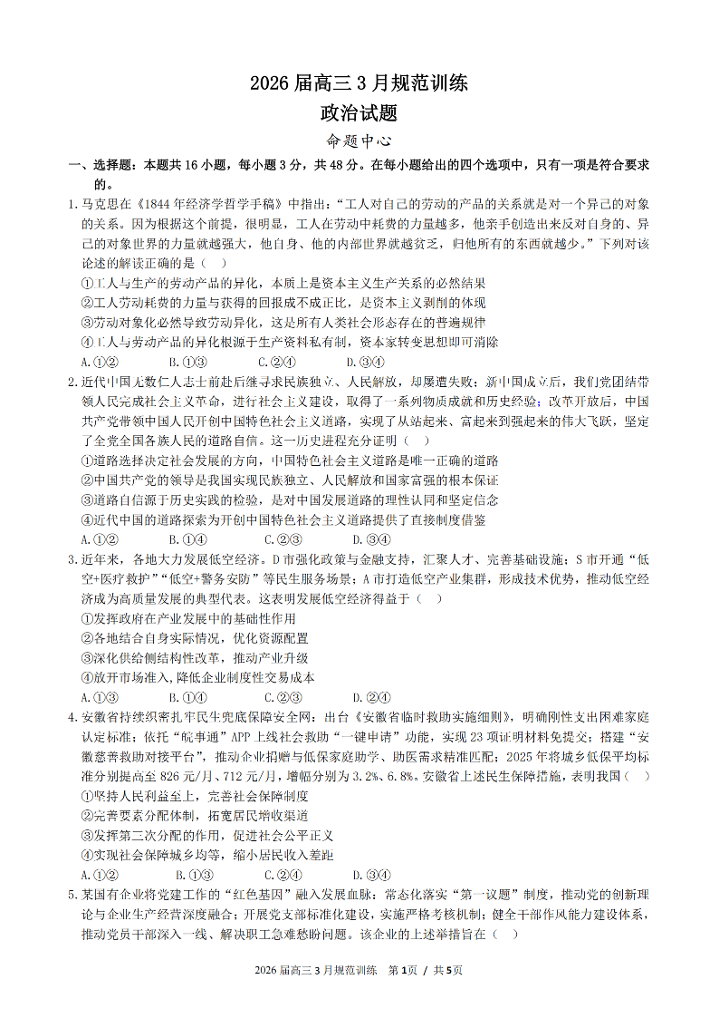 安徽省合肥市一六八中学2026届高三3月份规范训练 政治.pdf