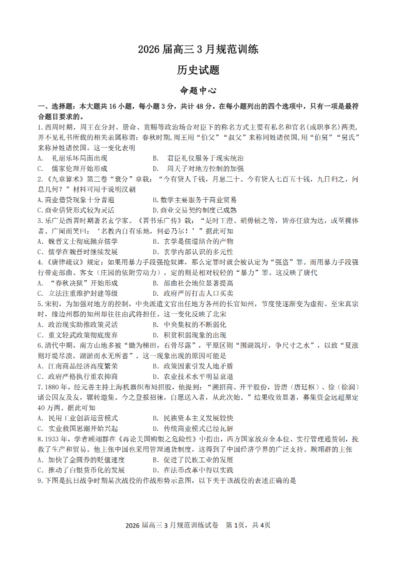 安徽省合肥市一六八中学2026届高三3月份规范训练 历史.pdf