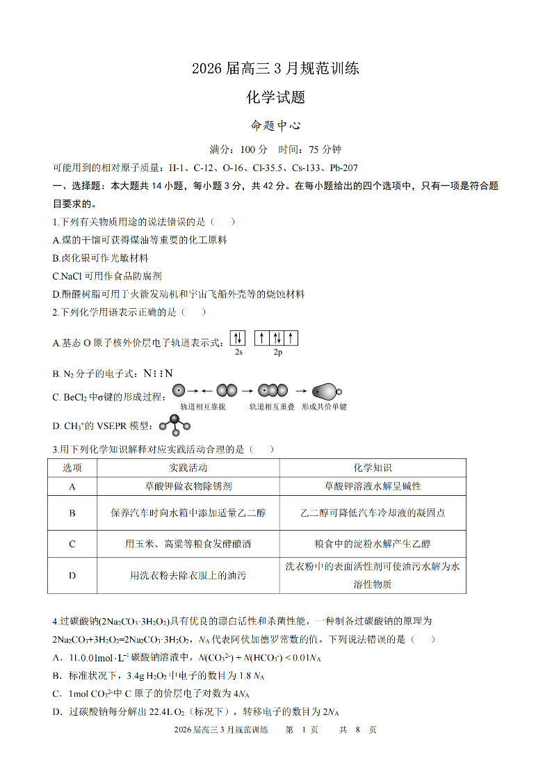 安徽省合肥市一六八中学2026届高三3月份规范训练 化学.pdf