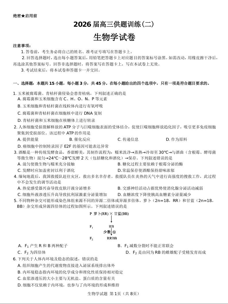 2026届高三供题训练(二)生物试题.docx