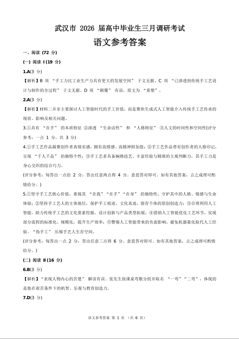 武汉市2026届高中毕业生三月调研考试 语文答案.docx
