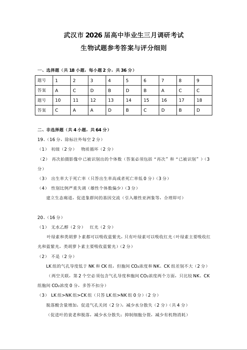 武汉市2026届高中毕业生三月调研考试 生物答案.docx