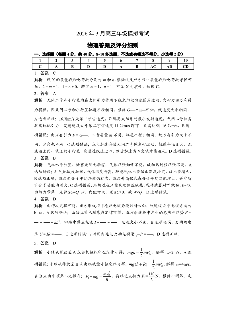 2026年3月高三年级模拟考试 物理答案.pdf