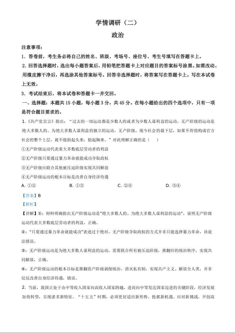 青桐鸣大联考2026届高三下学期学情调研(二)政治答案.docx