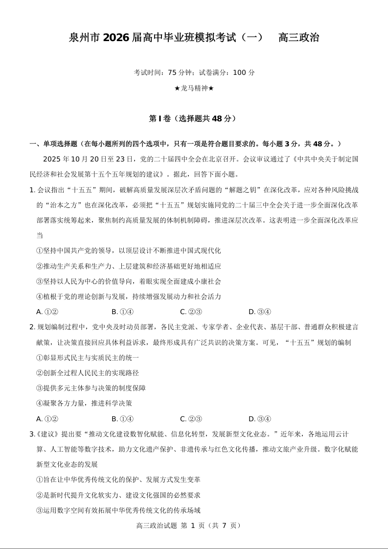 泉州市2026届高中毕业班模拟考试(一)政治.docx