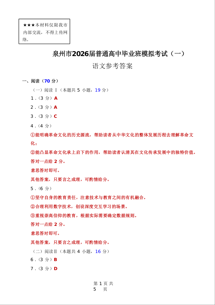 泉州市2026届高中毕业班模拟考试(一)语文答案.docx