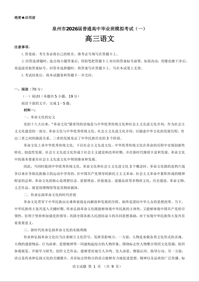 泉州市2026届高中毕业班模拟考试(一)语文.docx