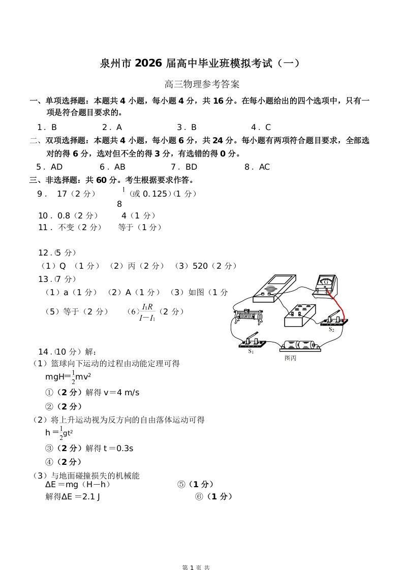 泉州市2026届高中毕业班模拟考试(一)物理答案.docx