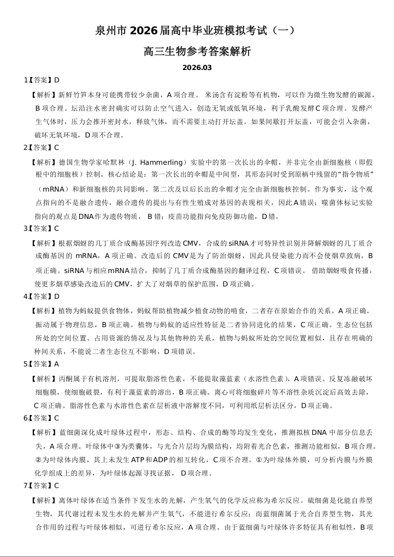 泉州市2026届高中毕业班模拟考试(一)生物答案.docx