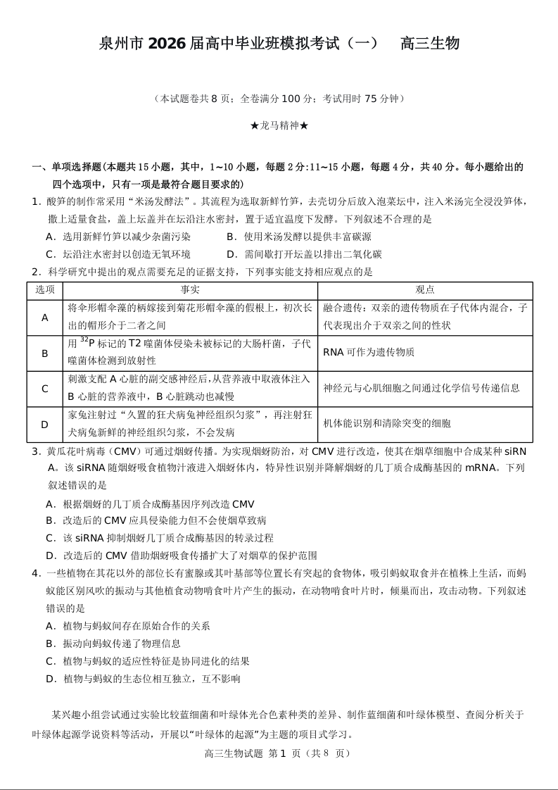 泉州市2026届高中毕业班模拟考试(一)生物.doc