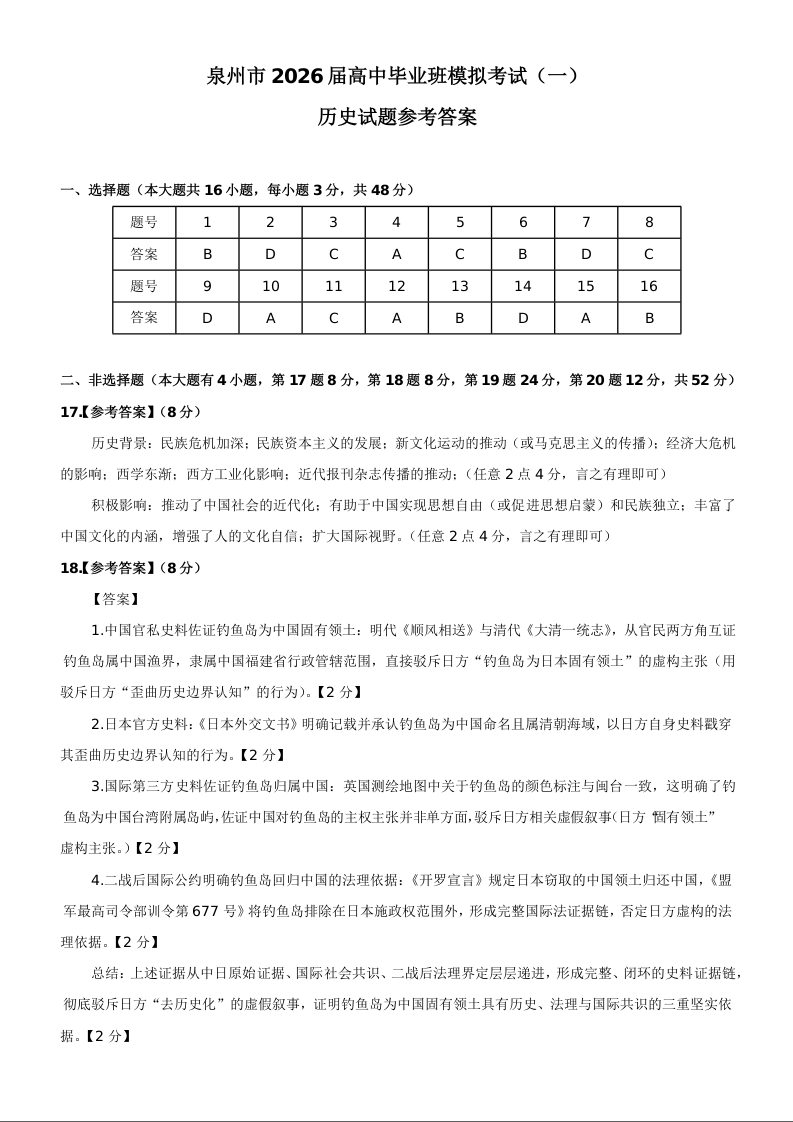 泉州市2026届高中毕业班模拟考试(一)历史答案.docx