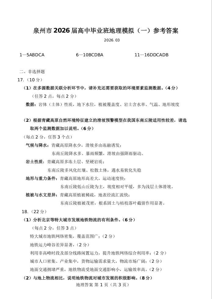 泉州市2026届高中毕业班模拟考试(一)地理答案.docx